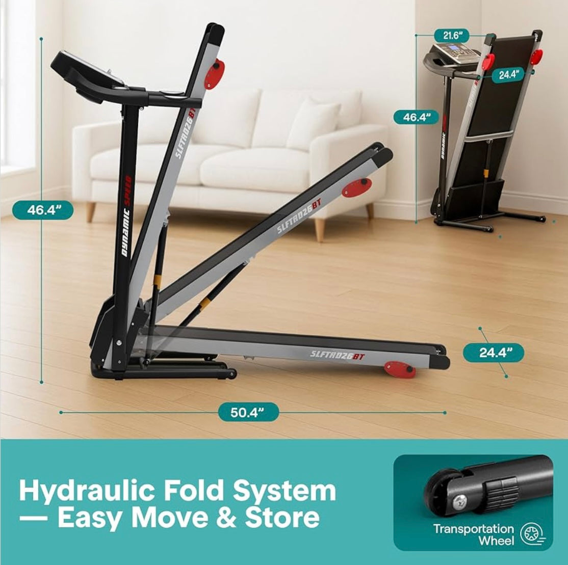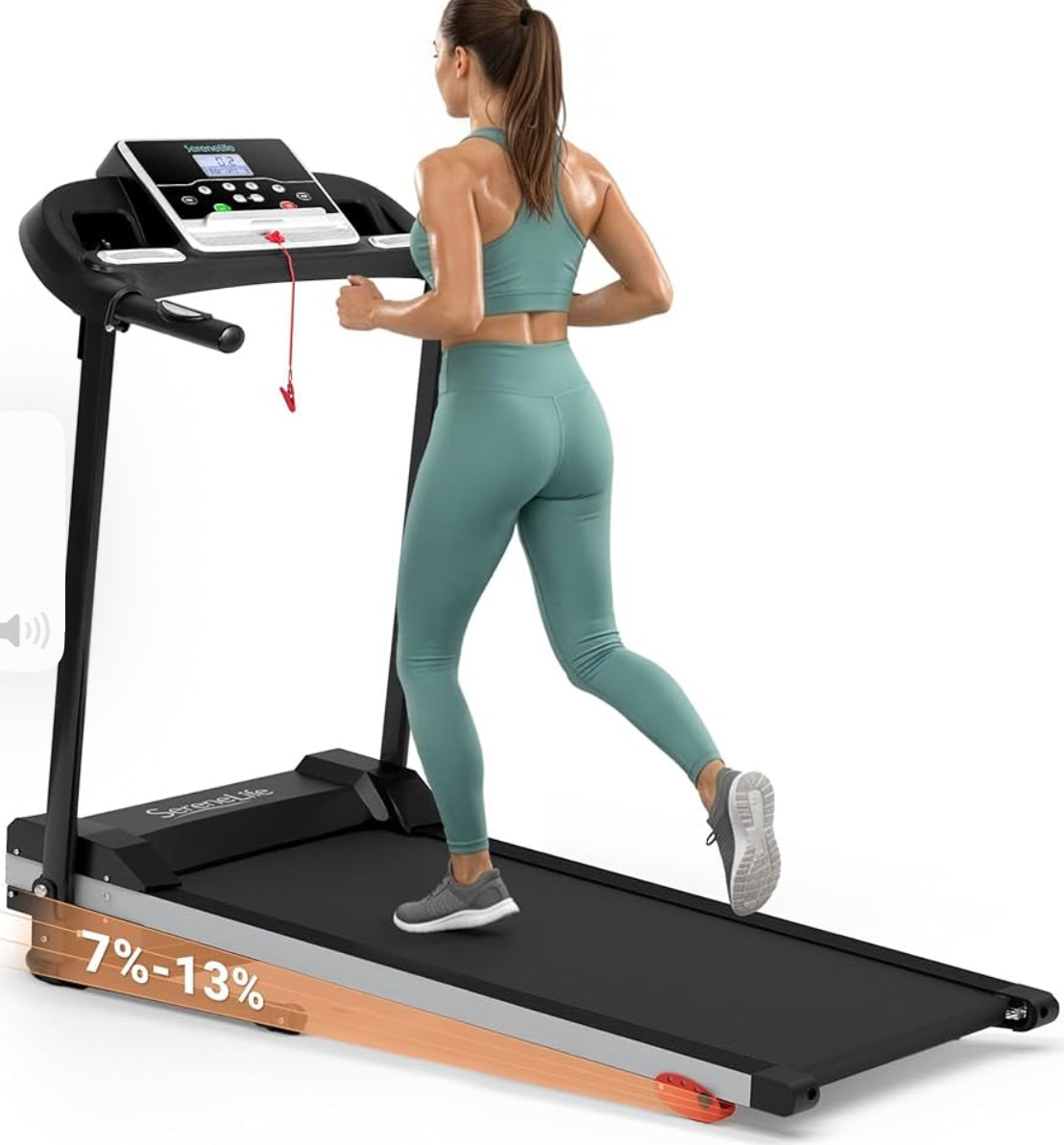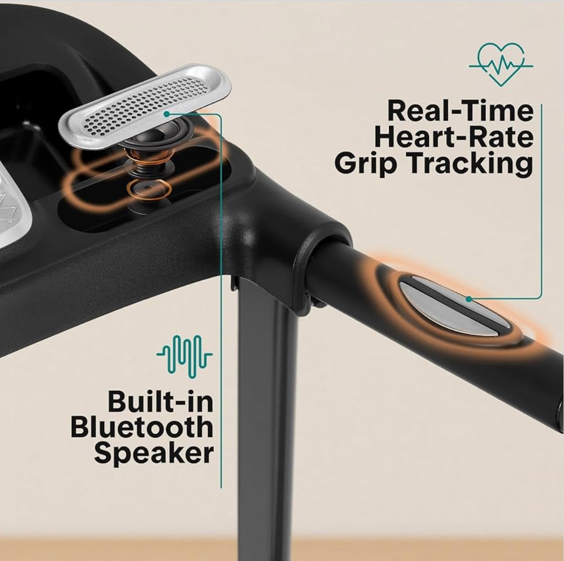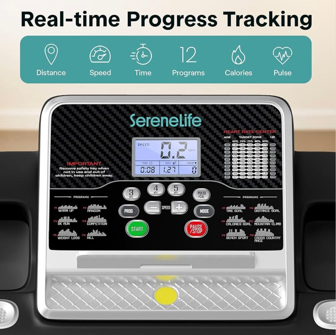 - Pantalla LCD: muestra datos de tiempo, distancia, velocidad, calorías quemadas. También tiene sensores de agarre para monitoreo de pulso y velocidad ajustable de 0.6-6.0 MPH